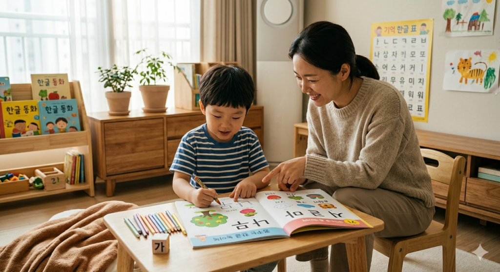 - 준비 단계 (3~4세): 글자를 공부가 아닌 ‘놀이’로 접하게 합니다. 간판 읽어주기, 이름표 붙여주기 등이 좋습니다.