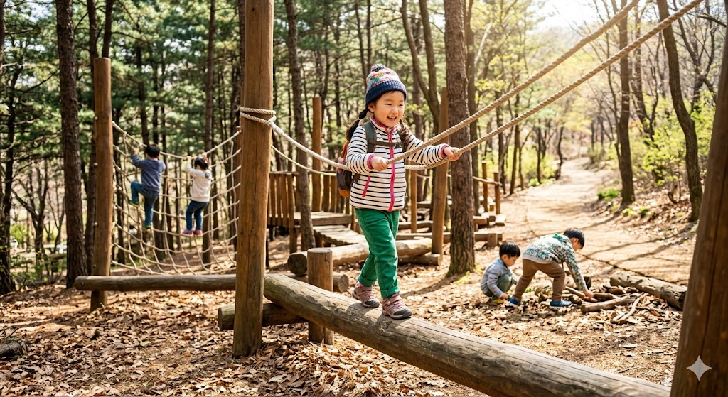 - 무리한 도전 금지: 유아숲체험원의 밧줄이나 흔들다리는 아이의 연령과 신체 능력에 맞는 것부터 차근차근 이용하게 해주세요. 특히 3월엔 아침이슬이나 서리로 인해 목재 시설물이 매우 미끄러울 수 있습니다.