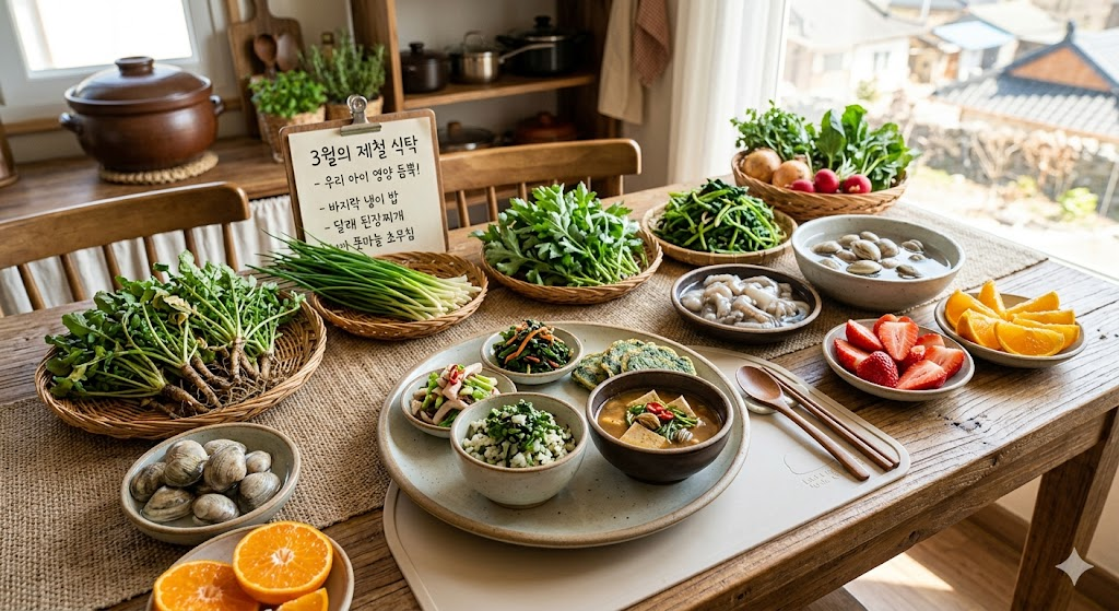 3월은 겨울을 이겨낸 생명력이 가득한 식재료들이 쏟아지는 시기입니다. 아이들의 성장을 돕고 면역력을 채워줄 3월 제철 채소, 해산물, 과일의 영양소와 특징을 정리해 드릴게요.